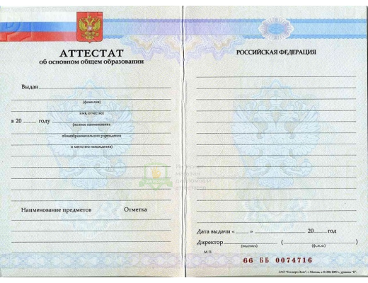 Прибрести аттестат за 9 класс 2007 - 2009 год вы можете в компании «ОК-Дипломы». Работаем на профильном рынке более 20 лет, предлагая клиентам высококачественный сервис и разумные цены. У нас аттестат за 9 класс 2007 - 2009 год выполняется на оригинальном бланке Гознак, дополняется подлинными подписями и печатями.
